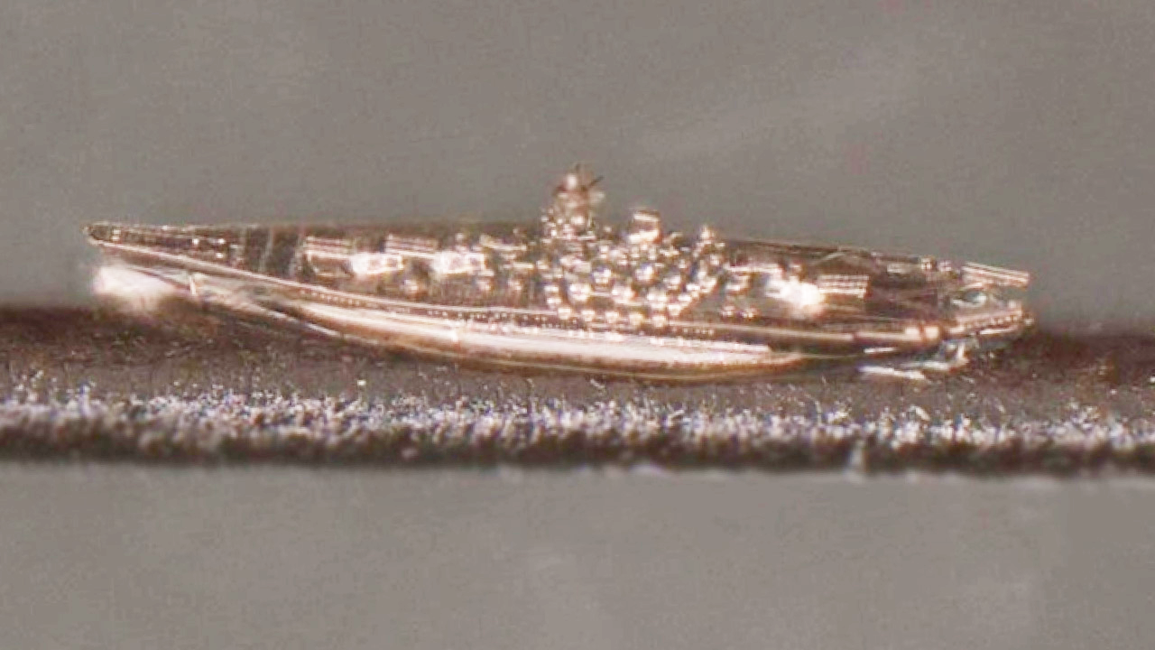The original battleship Yamato, which measured 263 meters in length, has been reproduced at a total length of 0.5 mm, and the main gun turret measures only about 0.003 mm in diameter.