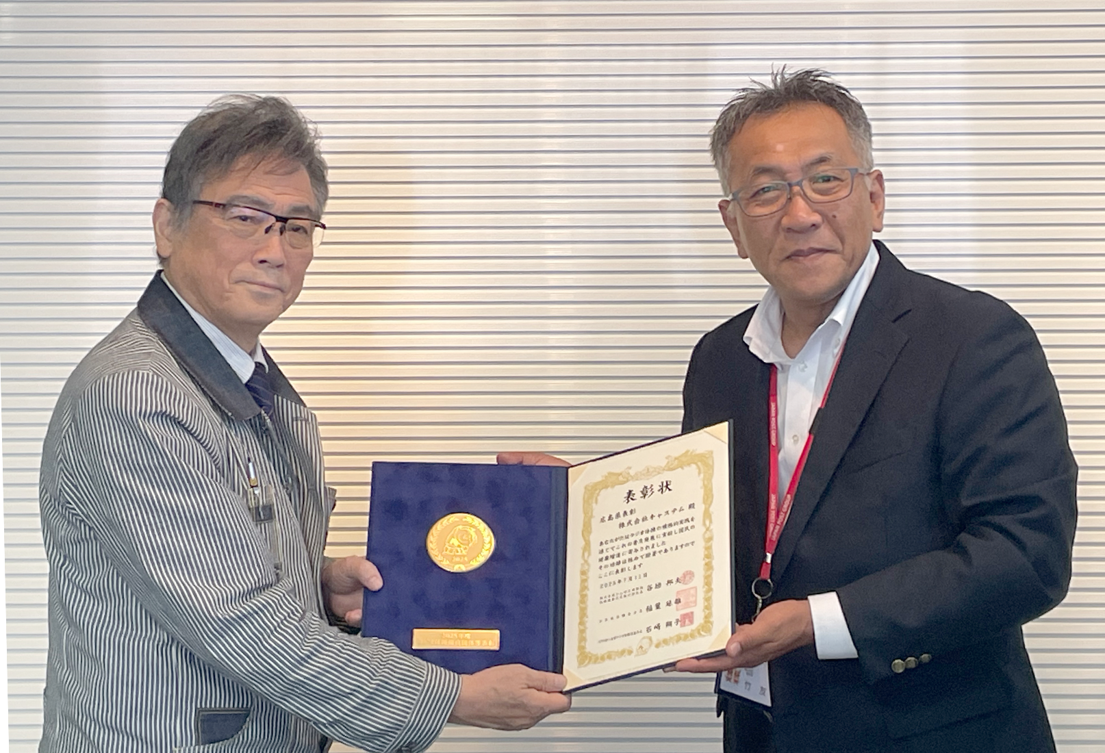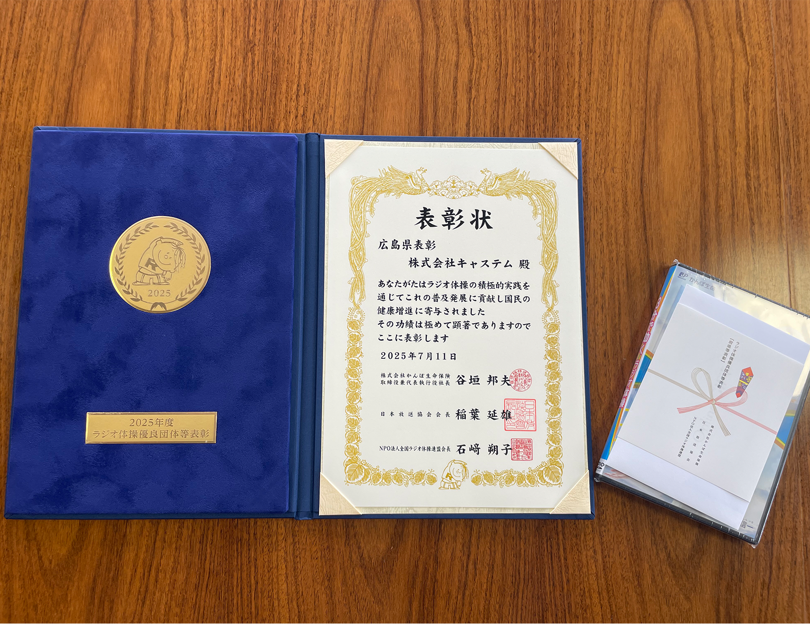 2025年9月25日、株式会社かんぽ生命保険 福山支店の皆様にご来社いただき、「2025年度ラジオ体操優良団体等表彰(広島県表彰)」を授与いただきました。