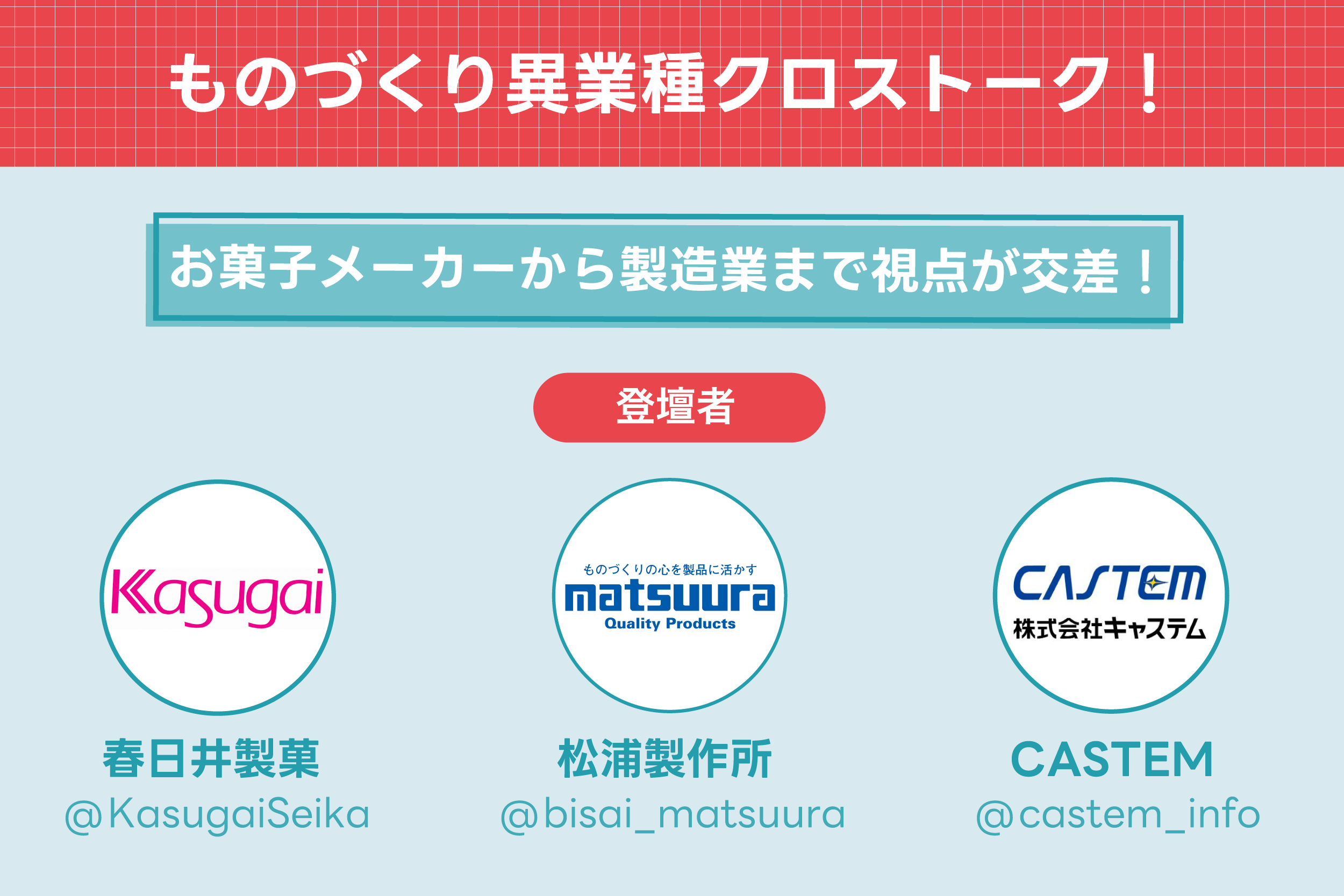 第1部は「ものづくり異業種クロストーク!」として、春日井製菓株式会社・株式会社松浦製作所・株式会社キャステムの3社が登壇。第2部は、事前質問をもとにダイス(サイコロ)で話者を決める交流型ワークショップを行い、学びとつながりの両立を目指します。