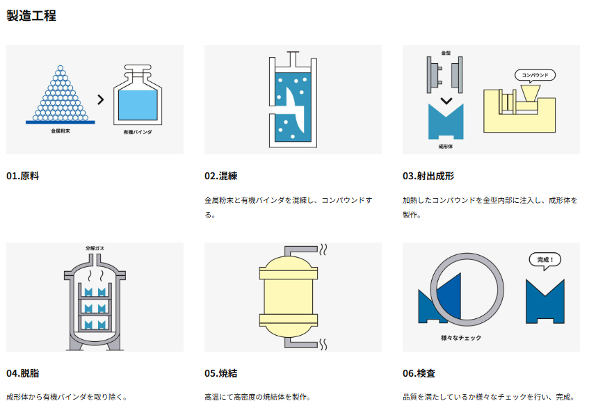 微細で複雑な三次元形状を得意とし、通常の焼結品よりも機械的強度・表面精度に優れた金属成形品を生み出します。鉄・ステンレス・チタンなど多様な金属に対応し、小さなボルトや歯車も加工レスで製造可能です。医療、航空宇宙など、微細で高精度な金属部品が求められる分野で活用されています。