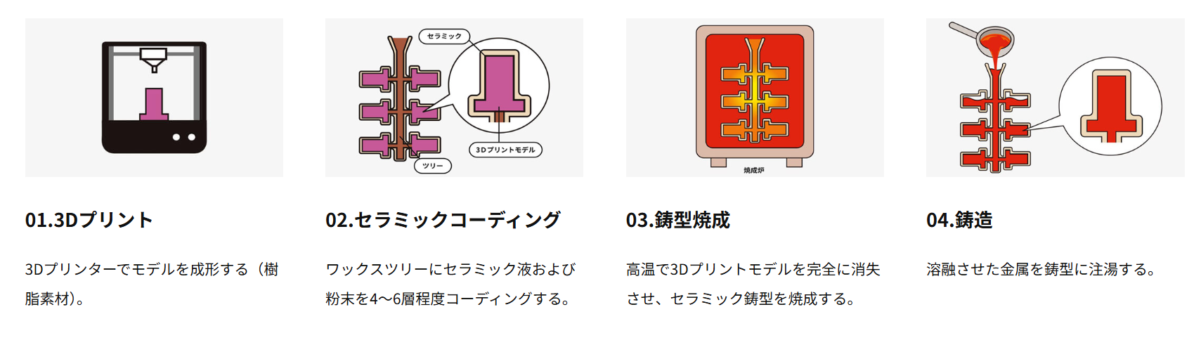 この製法は3Dプリントモデルを基にロストワックス精密鋳造と同様の工程で金属部品を作る「デジタルキャスト」の導入当初に使われていました。