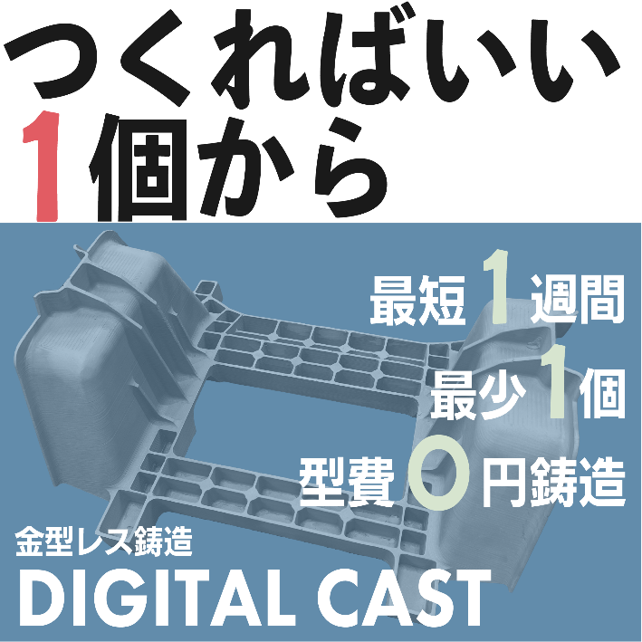 デジタルキャストは、3Dプリントモデルを製品モデルに使うことで金型なしで1個から鋳物を作ることができ、試作・開発段階での形状検証や超小ロットに最適。