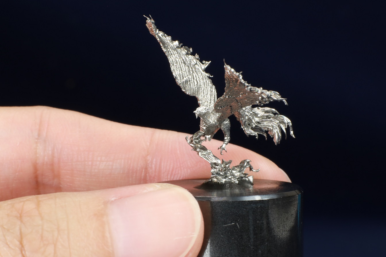 美しく燃え上がる炎をまとったフェニックスを、360°全切削加工で仕上げました。尾の部分やくちばし、足の爪も先端まで微細に加工し、口の中の造形までこだわっています。微細かつデザイン性の高い超複雑形状を加工するため、5軸加工機より加工精度に優れた「3軸マシニングセンタ」をあえて使用しました。