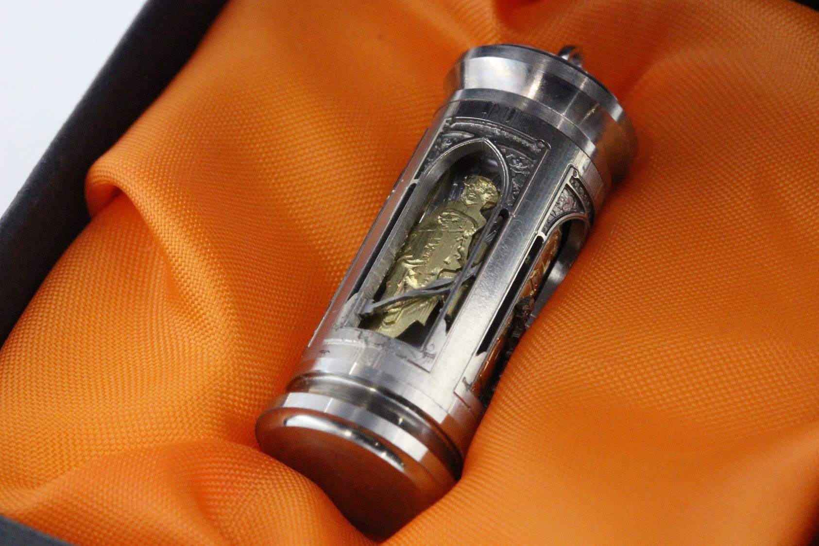 アルフォンス・ミュシャの名作「四つの時の流れ」をモチーフに、高さ30mmの筒の中に4面構造を持たせたペンダントです。意匠性の高いデザインを損なうことなく、精密加工によって立体的に再現しています。加工では5軸マシニングセンタを使用し、0.05mm以下の小径工具により多方向から削り出しを行いました。企画・デザイン・加工を3人で分担し、それぞれの得意分野を活かして完成させた作品です。本物の絵画のデザインを崩さないように、設計段階から綿密な連携を行い、加工制約を踏まえた形状調整を重ねました。