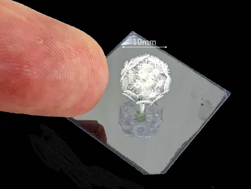 「一体どのようにして作られているのだろう」と誰もが驚く作品を目指し、超微細3Dプリント技術「Nanoscribeシステム」を用いて、たんぽぽの綿毛を指サイズに縮小して再現しました。綿毛の最も細い部分は直径わずか0.05mm。最先端の超微細造形技術と、粘度のあるレジストの使用により実現しました。さらに、見た目の美しさにもこだわり、綿毛を逆立てた形状で造形。仕上げの工程ではピンセットを使い、全体のバランスが整うよう丁寧に調整を施しました。